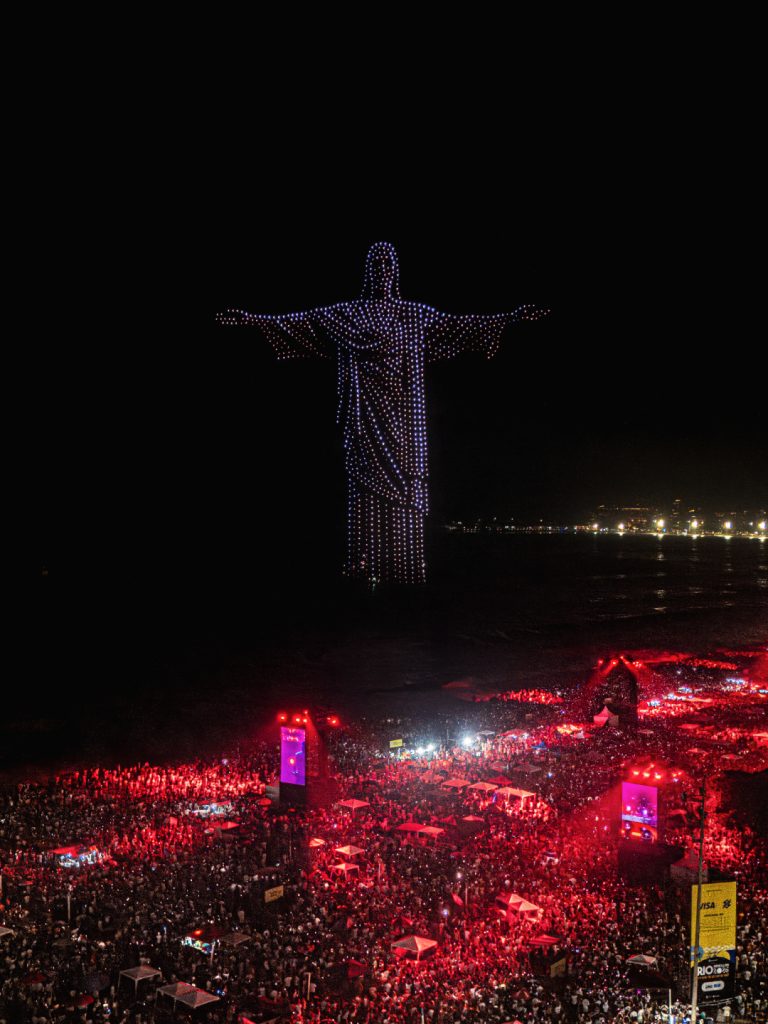 O momento mais emocionante da noite aconteceu quando a imagem do Cristo Redentor se formou no céu, em uma escolha estratégica de Alok para provocar reflexão e comunhão. A cena marcou a transição entre os anos com profundidade e comoção. Símbolo máximo do Rio de Janeiro e do Brasil, associado à acolhida e à espiritualidade, o Cristo surgiu a partir dos 1.250 drones, perfeitamente sincronizados à música e à narrativa do espetáculo. Poucas horas depois, vídeos desse momento já circulavam com força nas redes sociais e em páginas internacionais, projetando a imagem inédita da Praia de Copacabana para além do país e reforçando o alcance global da apresentação.