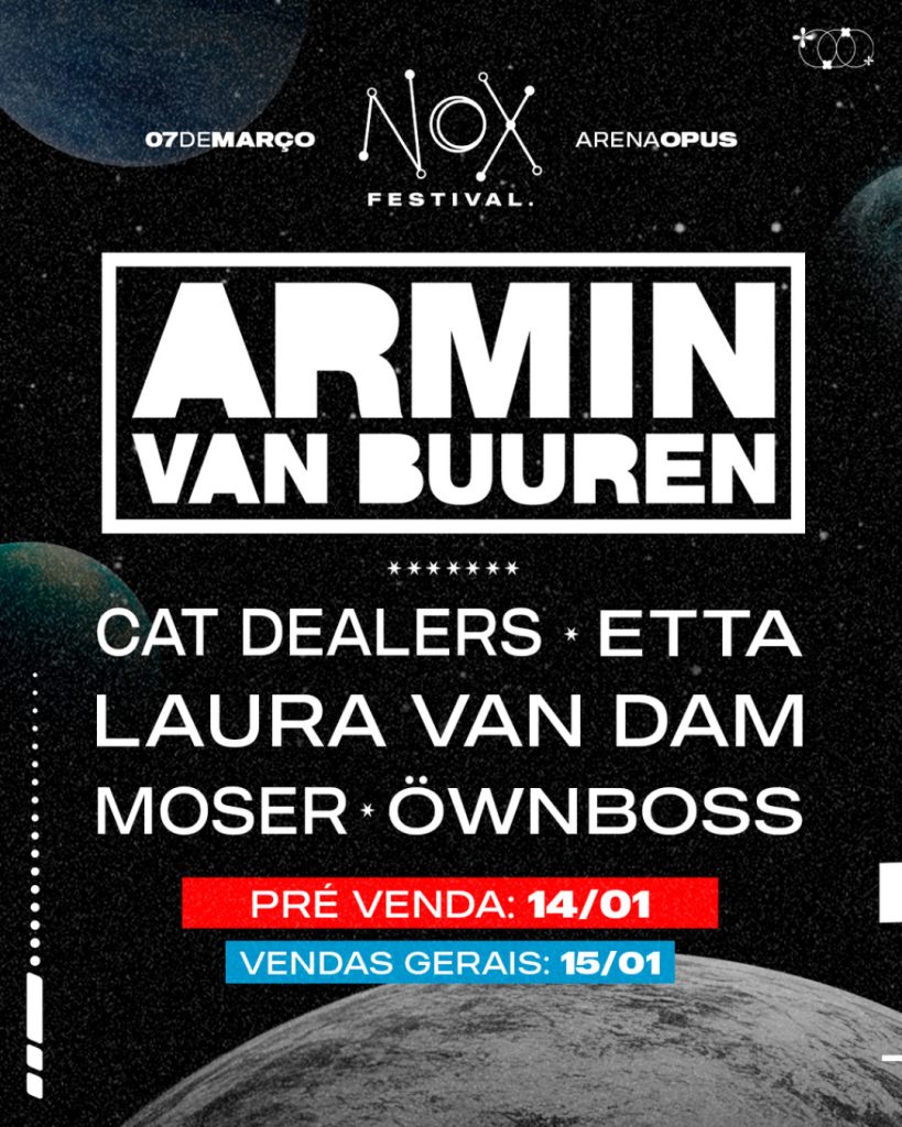 Logo em sua primeira edição, o NOX apresenta Armin van Buuren como headliner, um dos nomes mais influentes da música eletrônica mundial. Eleito o DJ número 1 do mundo pela DJ Mag por um recorde de cinco vezes, em 2007, 2008, 2009 e 2010 (quatro consecutivas), além de 2012, é o único artista a atingir essa marca. Ele também foi eleito o Nº 1 do mundo no Top 100 DJs de 2024, especificamente como DJ de Trance. No mesmo dia de sua apresentação no NOX, o público também poderá conferir os shows de Moser B2B, Etta, Öwnboss, Cat Dealers e Laura van Dam. Ao todo, seis atrações compõem o line-up que marca a nova aposta da Opus Entretenimento para um público que consome a música eletrônica como experiência sensorial, cultural e coletiva.