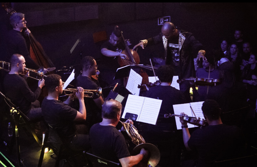 O Maestro Fabio Andres regendo a orquestra durante ensaio para a estreia no Manifesto Bar. Crédito: