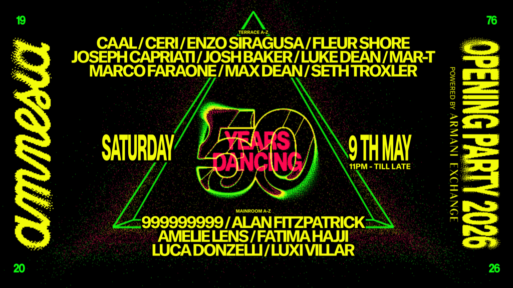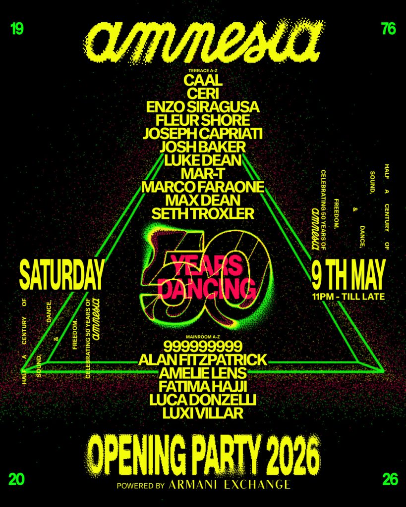Um momento marcante para a ilha, a festa de abertura deste ano promete entrar para a história. Um evento que representa a abordagem musical da Amnesia, o Terraço receberá Joseph Capriati, Josh Baker, Seth Troxler, Max Dean, Enzo Siragusa, Fleur Shore, Luke Dean, Ceri, CAAL, Marco Faraone e Mar-T. Na pista principal, Amelie Lens, 999999999, Alan Fitzpatrick, Fatima Hajji, Luca Donzelli e Luxi Villar.