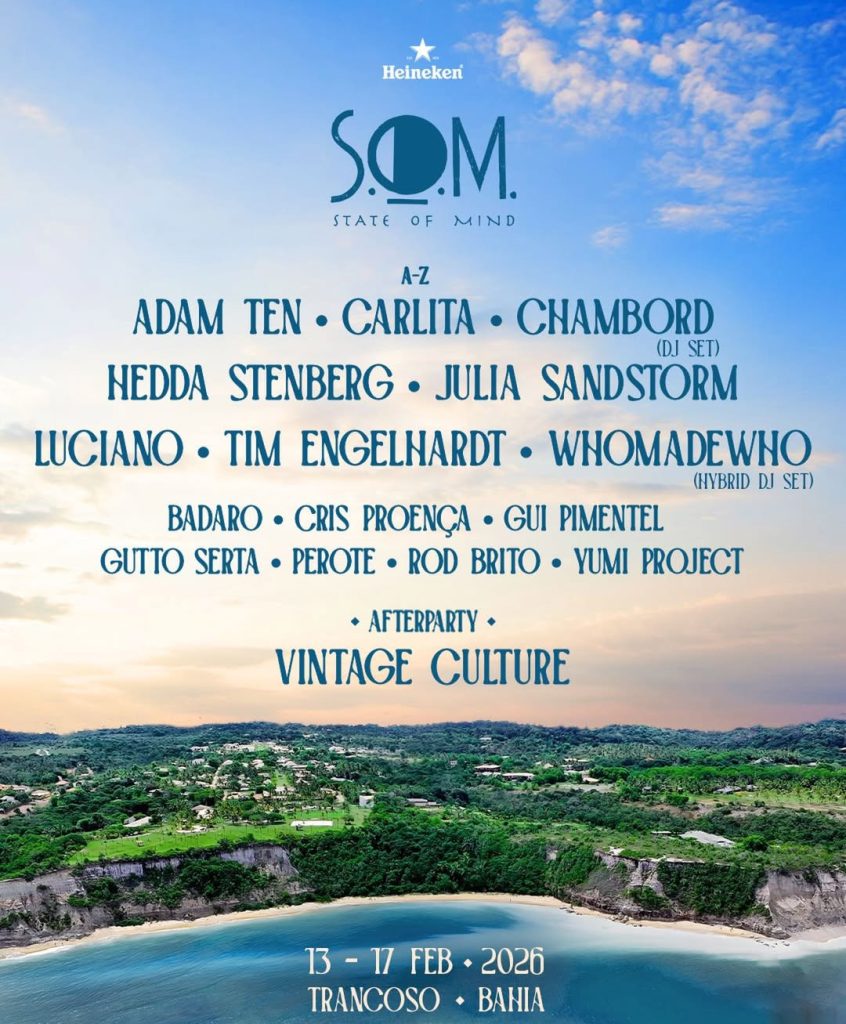 O S.O.M. Festival 2026 (State of Mind) acontecerá em Trancoso, Bahia, de 13 a 17 de fevereiro de 2026, durante o Carnaval, com uma proposta de música eletrônica, arte e experiências premium sob o tema “Terra Nova”. O evento terá festas com open bar premium, jantares temáticos e experiências de bem-estar, com ingressos sendo vendidos via plataformas como Ingresse e RA Entretenimento.