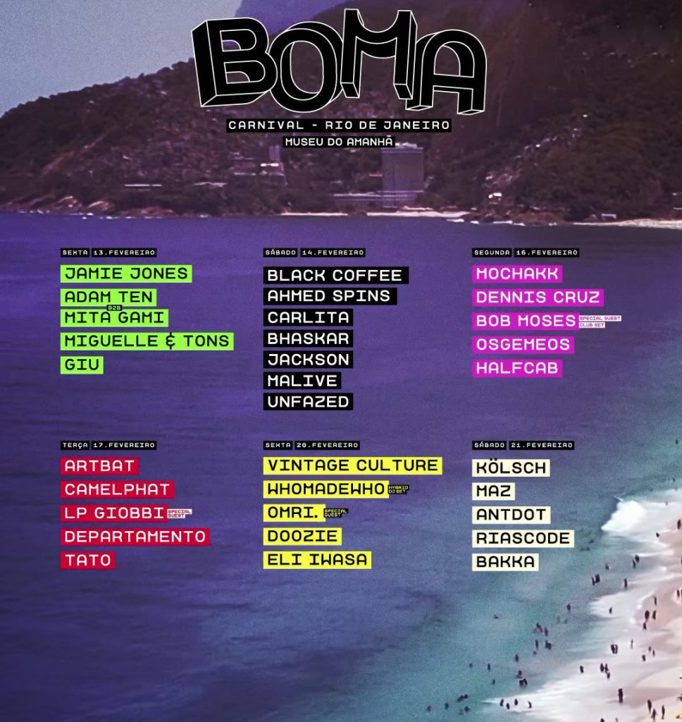 O BOMA Carnaval Rio 2026 acontece no Museu do Amanhã e reúne alguns dos principais nomes da música eletrônica global. A programação inclui artistas como Jamie Jones, Black Coffee, Vintage Culture, ARTBAT, CamelPhat, Kölsch, Bob Moses, Mochakk, WhoMadeWho, Adam Ten e Dennis Cruz, entre outros.