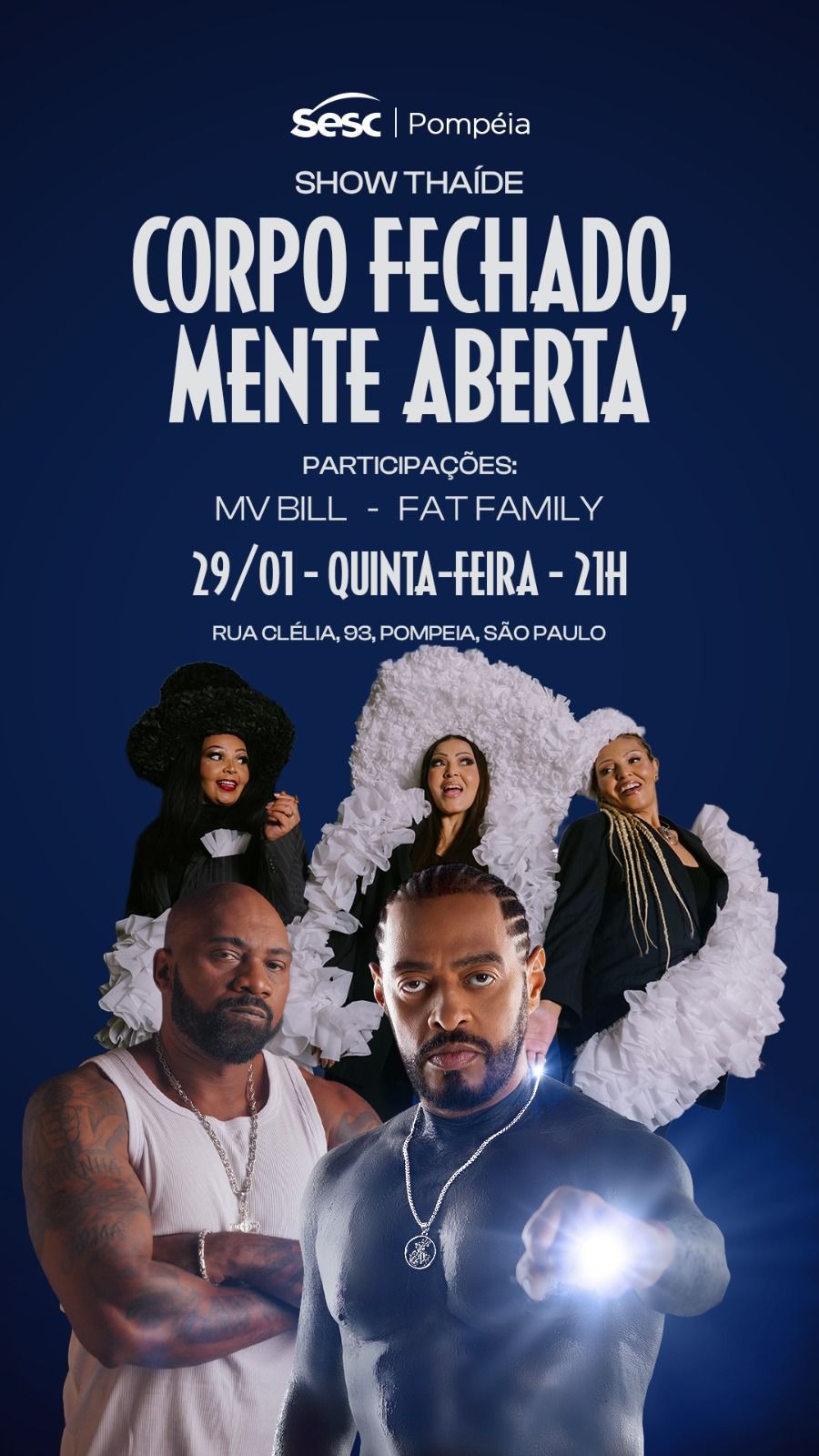 Thaíde apresenta “Corpo Fechado, Mente Aberta” com participação de MV Bill e Fat Family no SESC Pompeia.