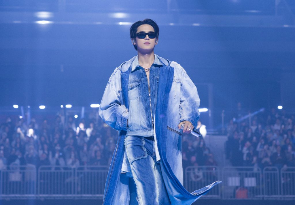 MINGYU vestiu um look jeans customizado da Calvin Klein, composto por um trench coat com capuz e comprimento até o chão, jaqueta trucker com zíper e uma calça bootcut de silhueta exagerada.