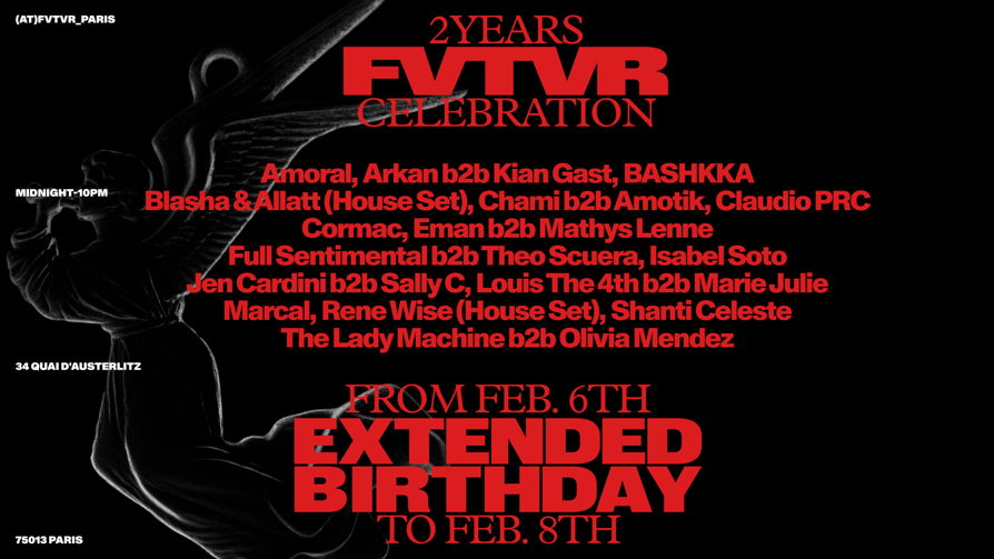 A segunda edição do evento é uma celebração da energia, paixão e criatividade que definem o FVTVR. Durante três dias de música ininterrupta, o local se transforma em um espaço vivo e pulsante, onde som, movimento e luz convergem. Os convidados são convidados a se perderem no ritmo, a se conectarem com outros dançarinos e a vivenciarem a intensidade e a intimidade que se tornaram a marca registrada do FVTVR. É um momento para homenagear os artistas, residentes e amigos que moldaram a identidade do clube, enquanto criamos novas memórias e experiências compartilhadas que continuarão a ressoar muito depois da última batida. Cada apresentação, cada projeção, cada lampejo de luz contribui para uma celebração singular e imersiva de comunidade e inovação.