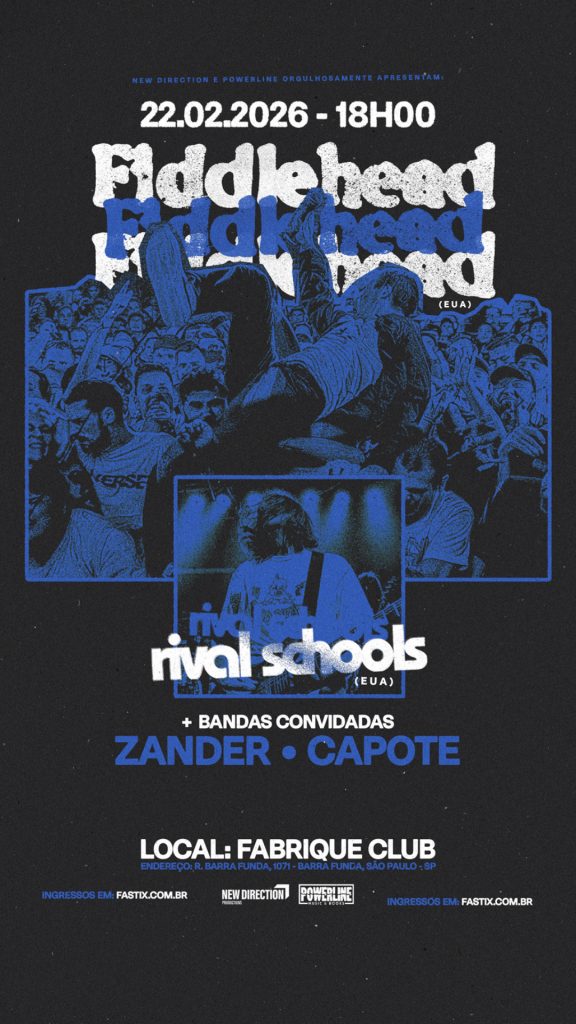 Fiddlehead e Rival Schools, duas destacadas bandas do rock alternativo/post-hardcore mundial da atualidade, respectivamente das gerações 2010 e 2000, estreiam no Brasil com show único no dia 22 de fevereiro (domingo) em São Paulo/SP. O evento, no Fabrique Club, começa às 18h e terá duas bandas nacionais na abertura: Zander e Capote.