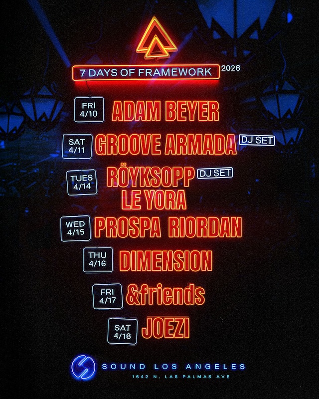 | A Framework também anunciou a programação de seu outro grande evento da temporada de festivais: 7 Days Of Framework At Sound . Entre 10 e 18 de abril de 2026 , a Framework receberá atrações de renome internacional no ambiente mais intimista da lendária boate Sound , em Hollywood , que pertence e é administrada pela Framework. A edição deste ano do 7 Days Of Framework At Sound contará com apresentações de Adam Beyer (10 de abril), Groove Armada (DJ Set) (11 de abril), Röyksopp e Le Yora (14 de abril), Prospa & Riordan (15 de abril), Dimension (16 de abril), &friends (17 de abril) e Joezi (18 de abril). |