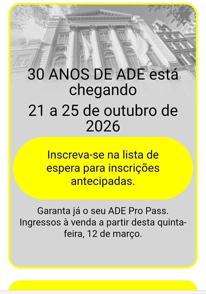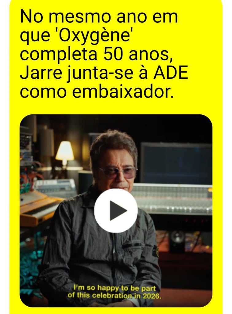 Garanta um dos cobiçados lugares para ‘Oxygène & Beyond: Uma Jornada Sonora Celebrando 30 ANOS DO ADE', disponíveis via MOJO nesta sexta-feira, ou adquira o ADE Pro Pass, disponível com preços promocionais de lançamento nesta quinta-feira.