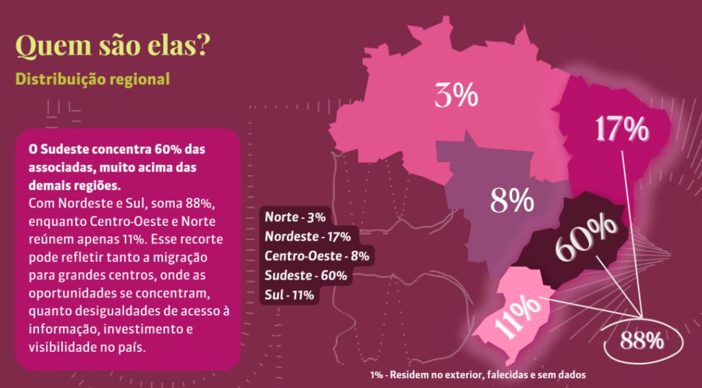 A distribuição regional das associadas da UBC mostra que o Sudeste, Nordeste e Sul continuam concentrando a maior parte das mulheres na música, somando juntas 88% do total. O Sudeste segue na liderança, enquanto o Norte registra a menor participação. Atualmente, 60% das associadas estão no Sudeste, 17% no Nordeste, 11% no Sul, 8% no Centro-Oeste e apenas 3% no Norte. A desigualdade geográfica reforça a importância de políticas e iniciativas que promovam uma distribuição mais equilibrada e incentivem mulheres de todas as regiões a ingressarem e prosperarem no setor musical.