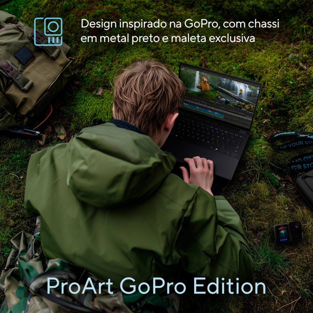 O ProArt GoPro Edition combina a estética robusta da GoPro com a precisão de engenharia da linha ASUS ProArt. O notebook traz acabamento Black Metal, detalhes inspirados na GoPro e uma case protetora para transporte e uso em ambientes externos, sem abrir mão de um visual profissional.