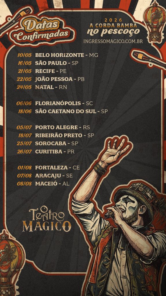 Após celebrar duas décadas de trajetória com a turnê “O Reencontro”, O Teatro Mágico inicia uma nova fase e anuncia sua próxima jornada pelos palcos do país: “A Corda Bamba no Pescoço”.