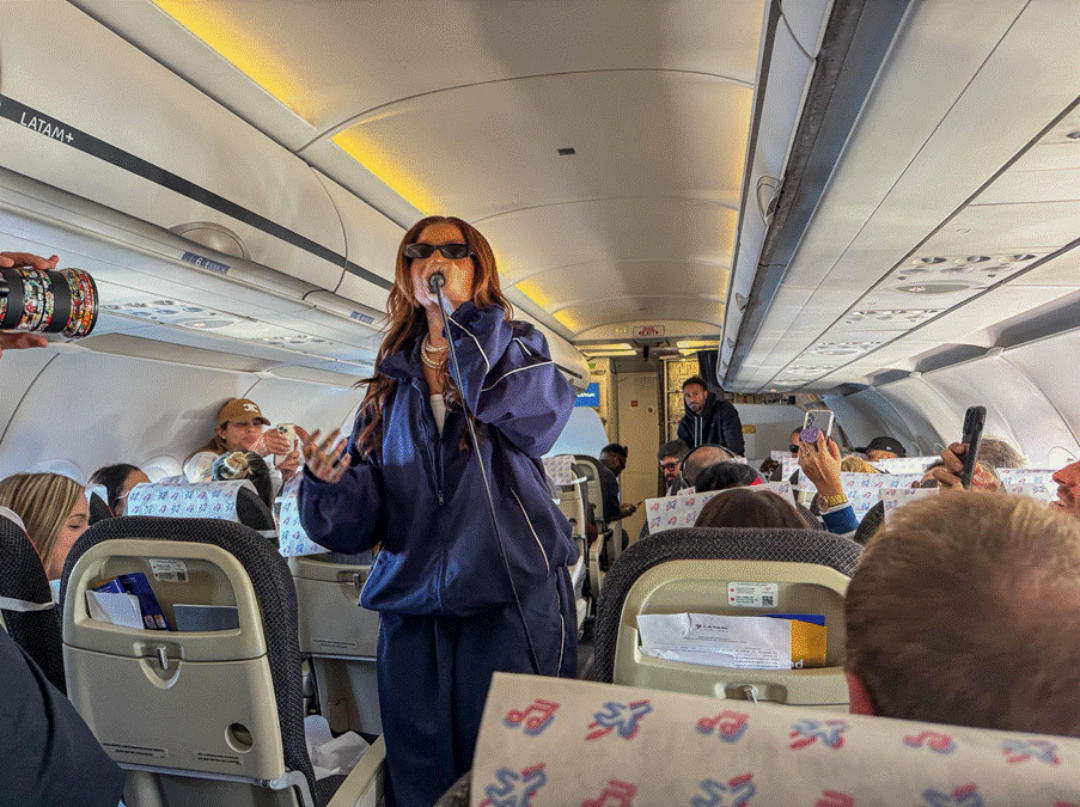 Abertura com: “Ludmilla realizou pocket show em voo de ponte aérea da LATAM nesta segunda, 1/9 (Divulgação LATAM)“