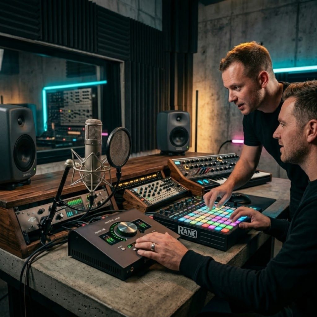 Controladores híbridos (Ableton Push 3, Denon SC6000 Prime, RANE Four): conectam hardware e software em tempo real, permitindo improvisação criativa, manipulação de samples e efeitos dinâmicos. Deadmau5 afirma: “É a tecnologia que expande a expressão, não que a substitui. Cada botão tem uma emoção por trás.”