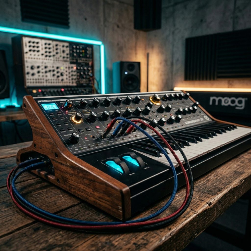 Sintetizadores (Moog, Elektron, Korg, Roland, Arturia): cada sintetizador é um universo de texturas sonoras. Moog é sinônimo de timbres analógicos icônicos; Roland traz clássicos que marcaram a história da dance music; Elektron e Arturia combinam inovação digital com expressividade analógica.