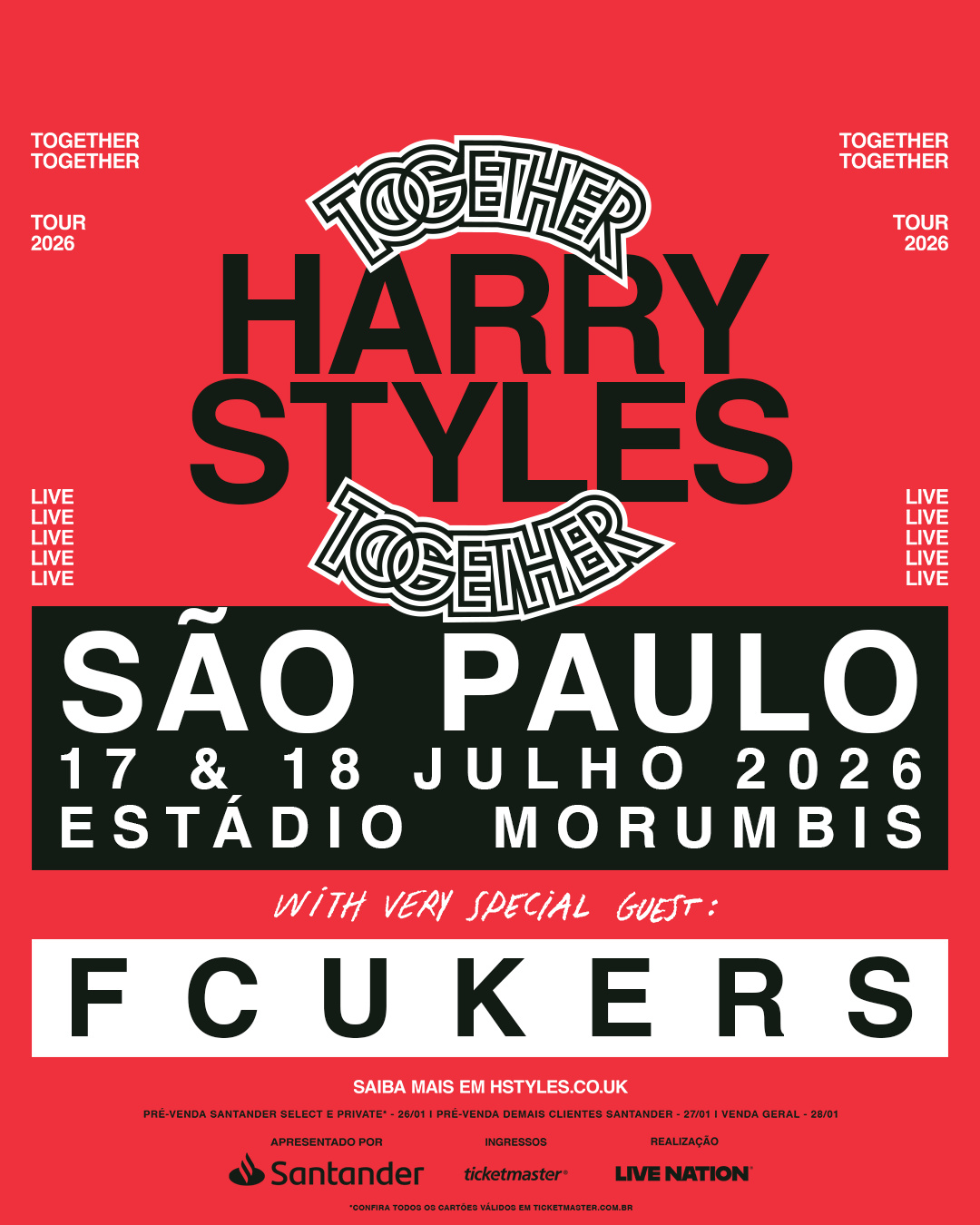O superstar internacional Harry Styles fará seu aguardado retorno aos palcos globais com uma residência em sete cidades. Promovida pela Live Nation, a Together, Together contará com 50 apresentações em Amsterdã, Londres, São Paulo, Cidade do México, Nova York, Melbourne e Sydney, entre maio e dezembro.